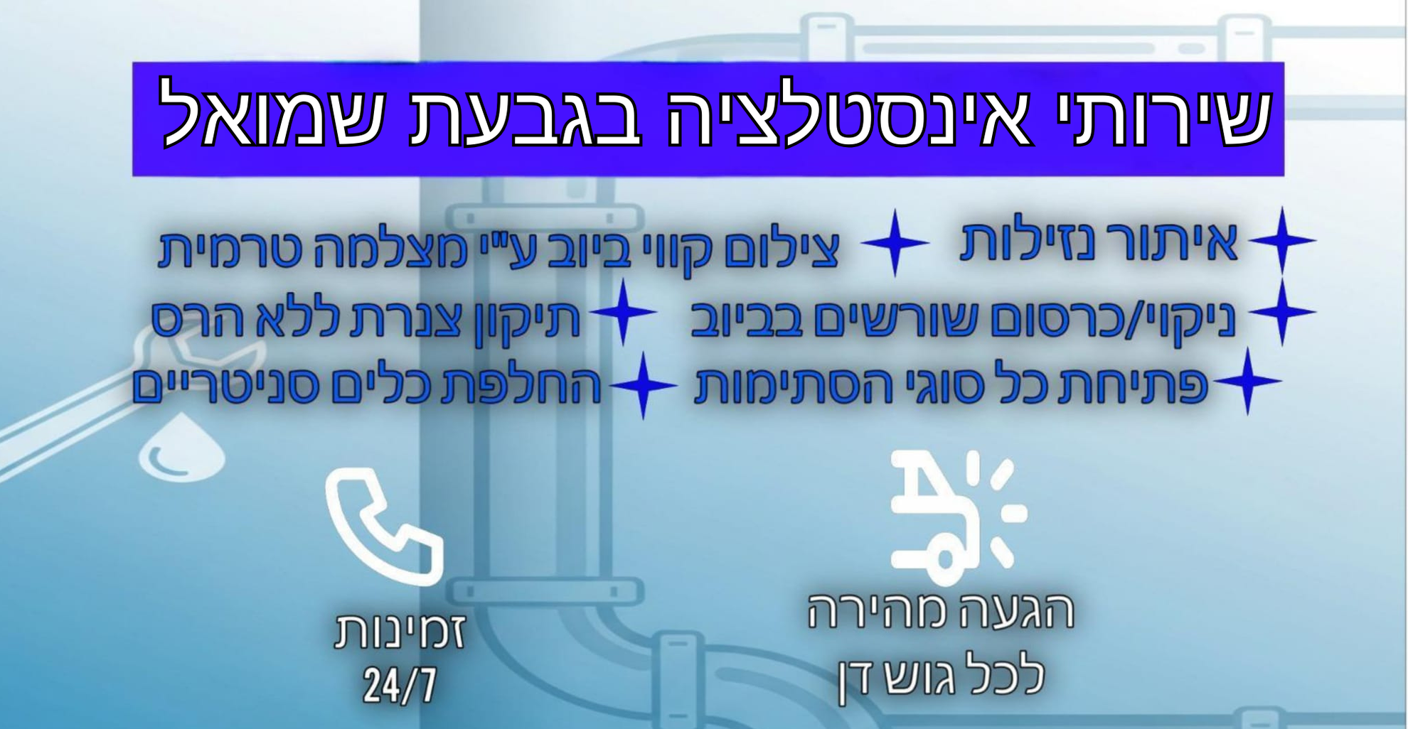 לקבלת מענה מהיר לכל שאלה,ייעוץ או הזמנת אינסטלטור אמין בגבעת שמואל – צרו קשר בכל שעה. רחמים האינסטלטור כאן בשבילכם באחריות מלאה וליווי אישי- זמין 24/7.